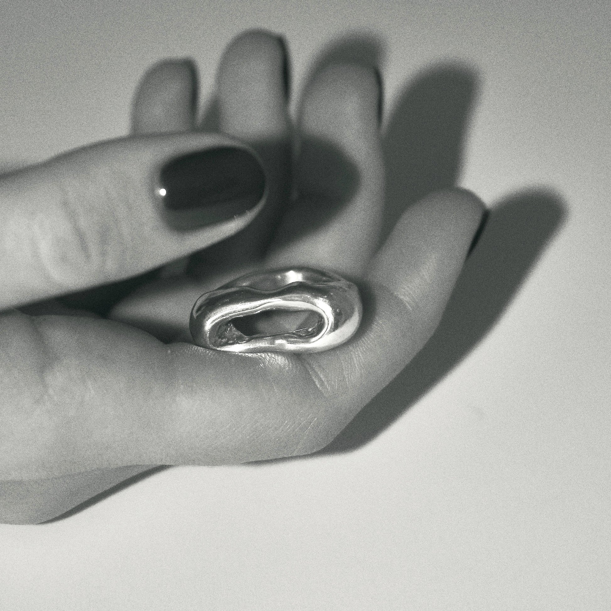 A sculptural sterling silver ring with a centered opening.
